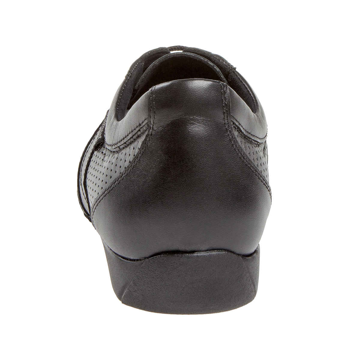 Diamant mens Ballroom Sneaker dance shoes Made in Germany handcrafted in sportive Oxford style with closed 5-hole lacing and padded upper edge. This dance shoe is manufactured in width H (wide feet) equipped with a shock-absorbing 2,5 cm Wedge heel and a continuous chrome leather sole combined with a rubber sole on the heel. As interior lining a breathable and moisture-absorbent microfiber from an Italian premium producer is used. For the upper materials made out of black leather combined with black leather perforated leathers of highest quality are used.