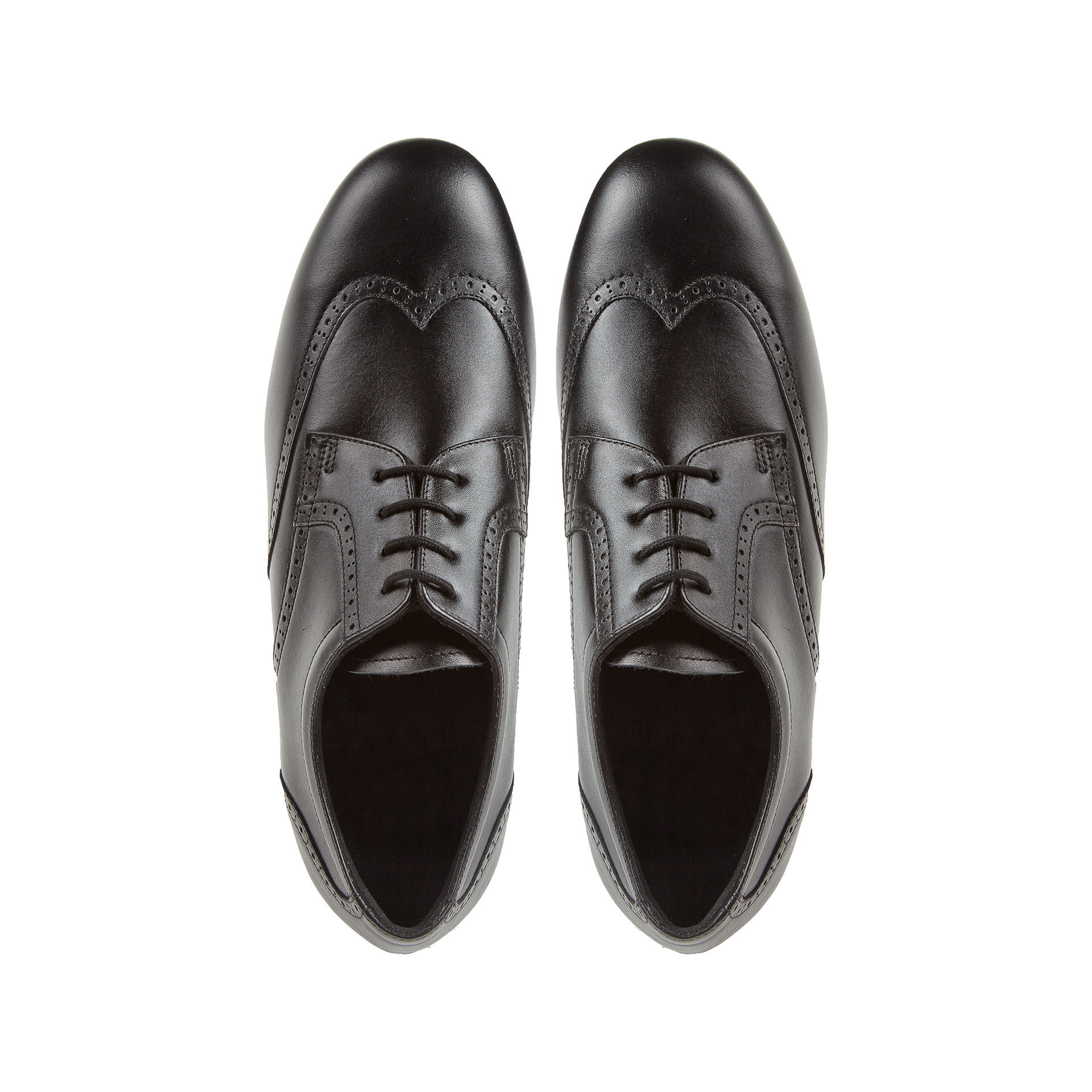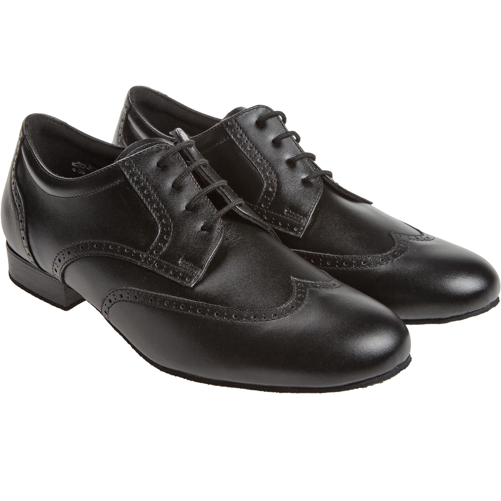 Diamant mens VarioSpin dance shoes Made in Germany handcrafted in classic full-brogue Derby style with open 5-hole lacing and padded upper edge. This dance shoe is manufactured in width H (wide feet) equipped with a shock-absorbing 1" standard heel. As interior lining a breathable and moisture-absorbent microfiber from an Italian premium producer is used. For the upper material made out of black leather a high-class nappa from Italy is used.