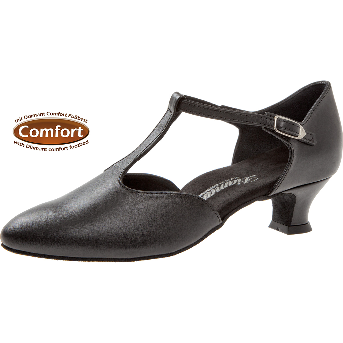 Femmes chaussures de danse de Diamant Latine fabriqueés en Allemagne à la main en forme de T. On produit les pumps fermés avec un bouton-pression qui est réglable de manière continue pour ouvrir et fermer rapidement à une lanière. On produit cette chaussure de danse en large G pour des pieds grandes avec un assise de pied Diamant Comfort et un talon de 4,2 cm Spanish avec une superficie grande. Comme matériau intérieur on utilise microfibre qui est thermoactif et qui absorbe l’humidité, c’est d’une production premium italienne. Pour le matérial extérieur du cuir noir on utilise du veau nappa d’Italie.