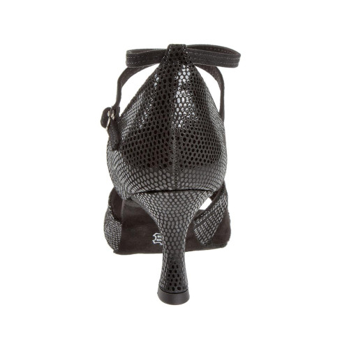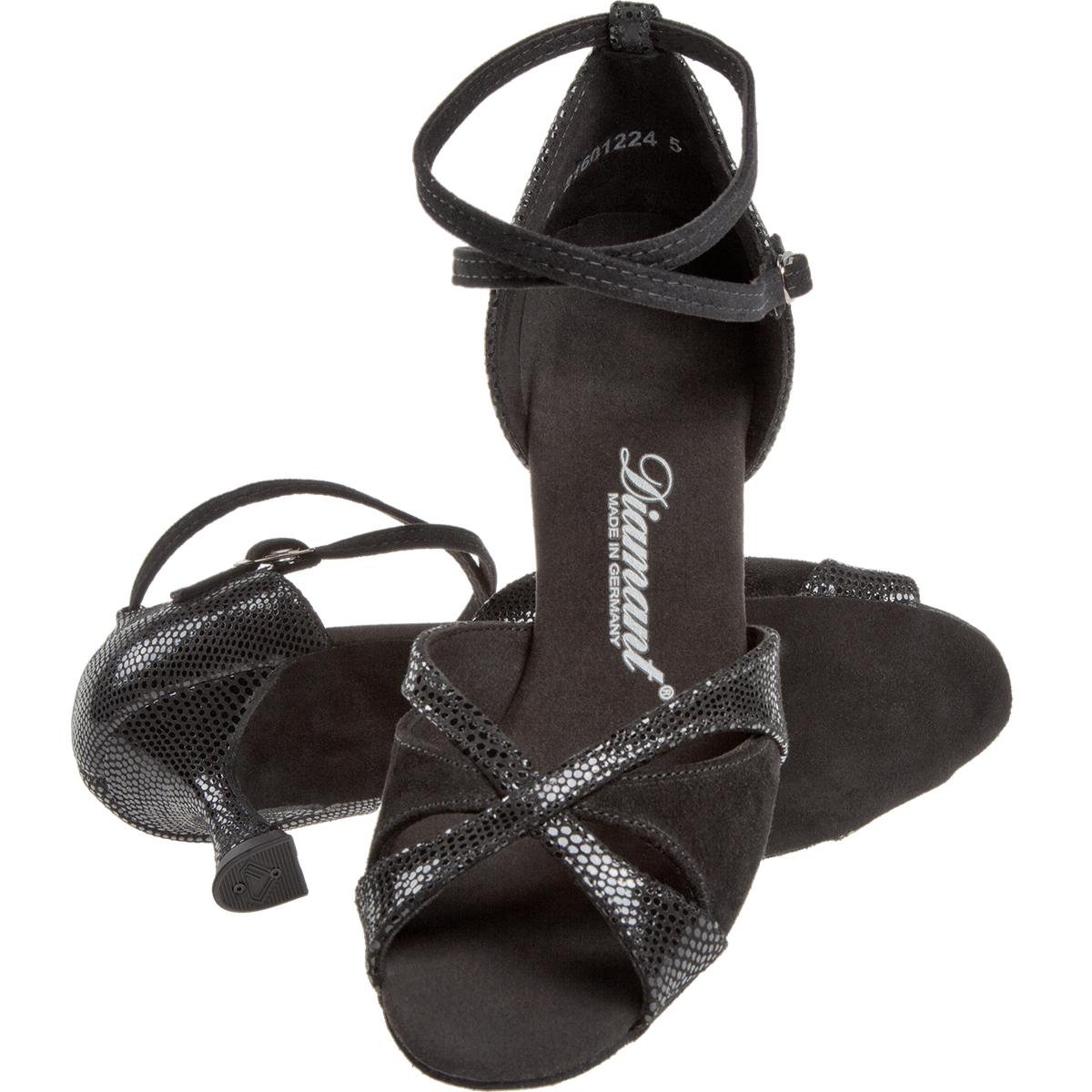 Scarpe da ballo latino da donna Made in Germany della Diamant realizzate a mano con la mascherina a tre cinturini sovrapposti, che si adattano al piede. I sandali aperti in punta sono realizzati con una fibbia a bottone automatico regolabile senza gradini che continua per una rapida apertura e chiusura della cinghia incrociata sul tallone. Queste scarpe da ballo sono prodotte in ampiezza F (ampiezza normale) con il tacco elegante Flare di 6,5 cm. La fodera è in microfibra traspirante che assorbe umidità, prodotta con pregiata manifattura italiana. Per i materiali del rivestimento esterno della pelle scamosciata (velour) con stampa rettile di colore nero con la stampa con lamina pregiata combinata con la nappa scamosciata (velour) di colore nero vengono utilizzate le pelli morbide di alta qualità provenienti dall'Italia.